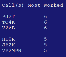 During contests I enjoy trying to "sweep" as many stations as possible on all 6 contest bands, so I added a report showing the calls most worked and next most worked at the end of the statistics display: