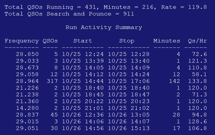 The times I was able to get runs going and when I wasn't, as well as the degree to which I neglected other bands besides 10 meters are obvious, which are great points of reference for the future.