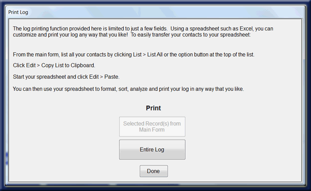 File > Print Log (AC Log's File Menu) provides access to simple printing of your log from within AC Log. After selecting this option the Print Log form below appears. It will provide information to simply print your log "as is" from AC Log. Click Done when you are finished.