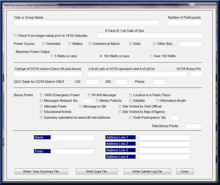 If you click OK on the information form, a Cabrillo Summary Form will appear as shown in the graphic below. You do not need to fill out this form for the Field Day contest. Just click Done to exit this form.
