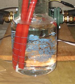 Here, the pex tubing feeding the pump (behind the jar) draws water out of the container. Fluid returning after it has passed through the coil in the thermal storage tank empties back into the jar. It is important that both ends of the pex stay below the water level or some of your fluid may siphon back and over flow the jar when the pump shuts off. My jar happens to be at about the lowest point in the system, but works fine.
