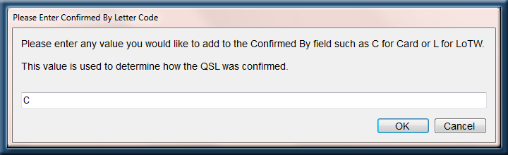 After you have highlighted the records you wish to mark, click either "Sent" or "Received" from this Edit menu option. The form in the graphic below will appear, and you can mark the records with a code. The typical codes are C = Card, L = LoTW and E = eQSL.